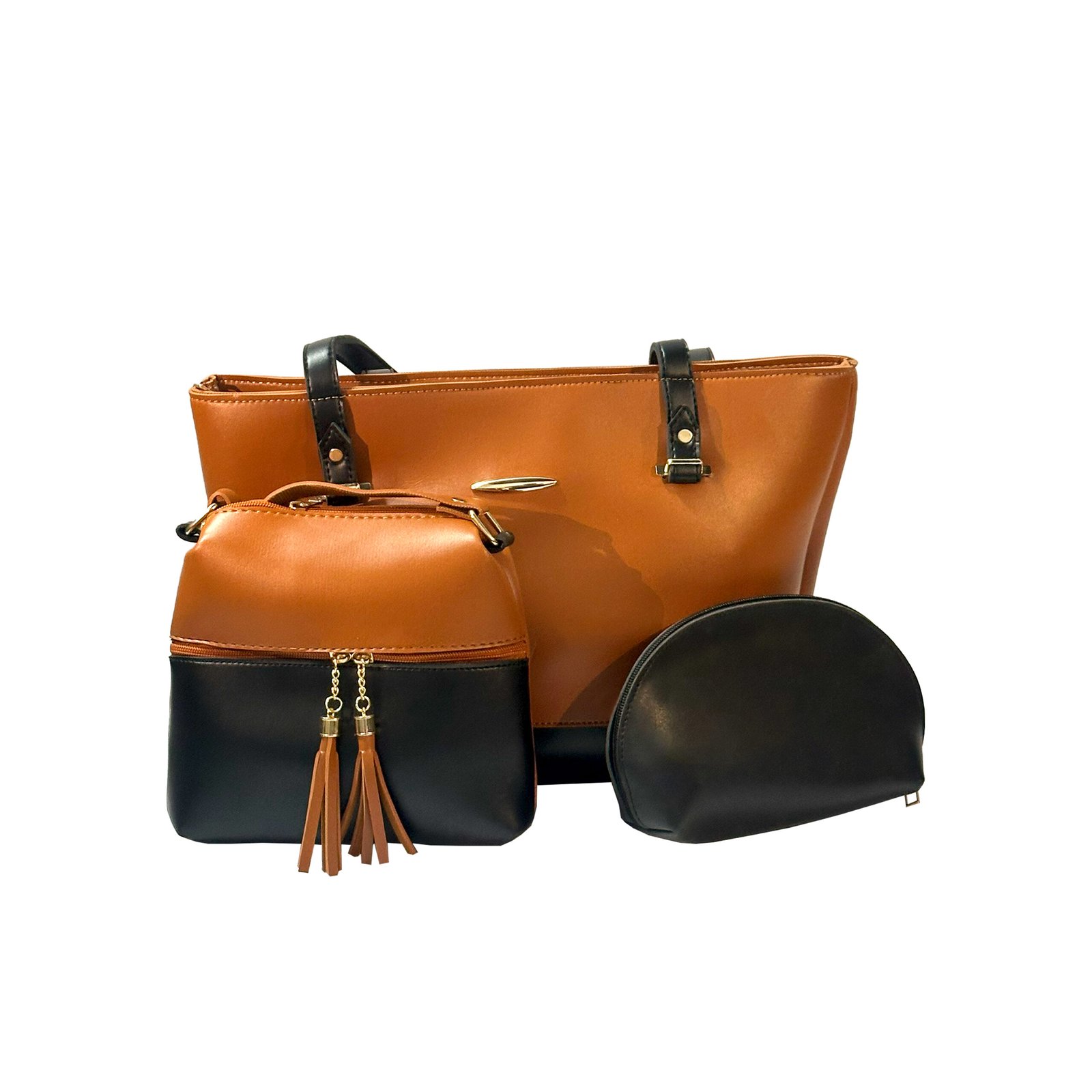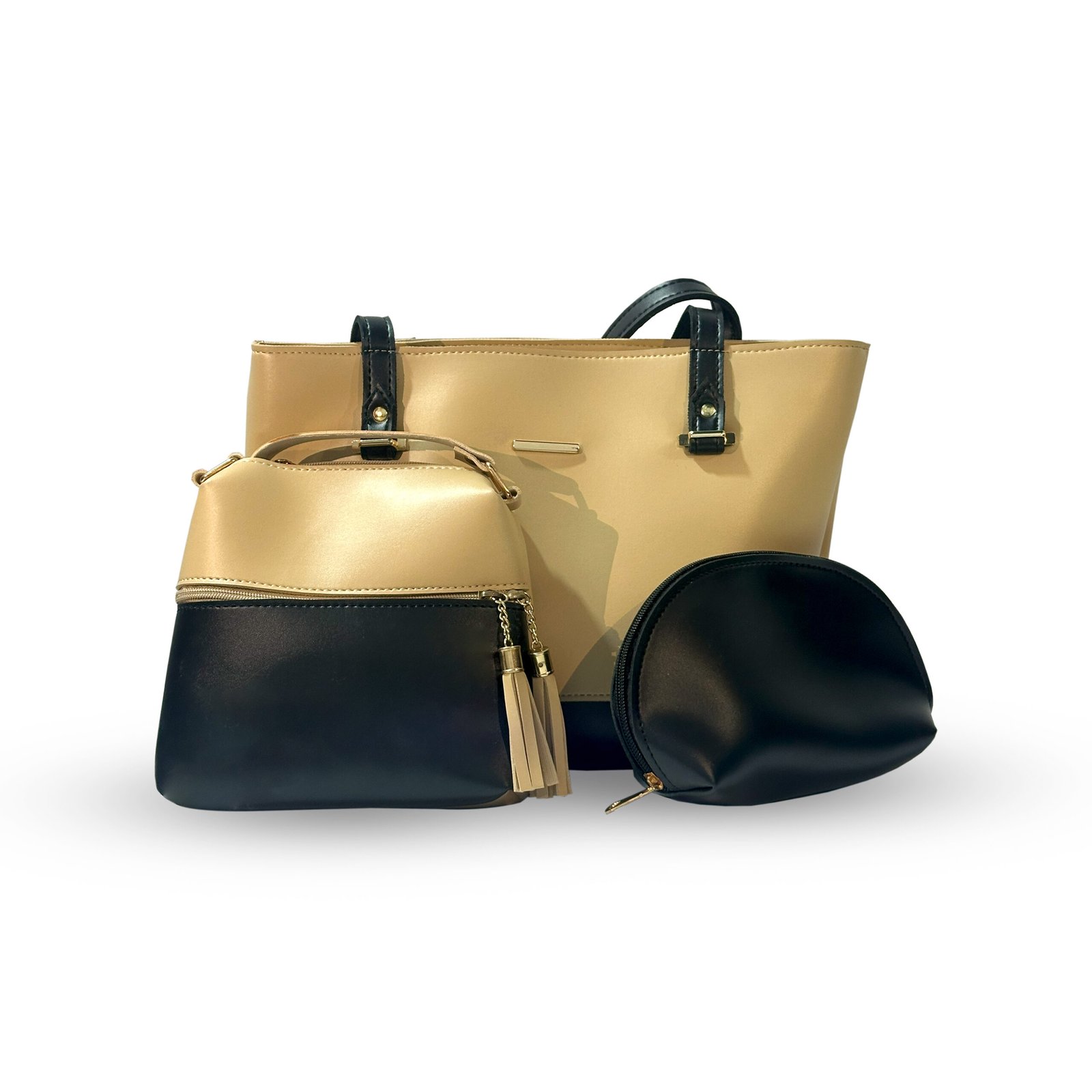 The DREAM SET is a sophisticated three-piece collection that offers versatility and coordinated style for any occasion. This set combines a roomy, structured tote, a compact cross-body bag, and a matching half-moon pouch, ensuring you have the perfect accessory for every need. The design features elegant color-blocking and playful tassel accents, making it a functional and beautiful addition to your wardrobe.